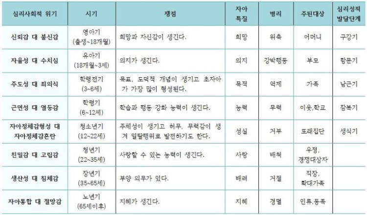 에릭슨(1902~1994)은 성격 발달에서 가장 중요한 요인이 자아이며 전 생애에 걸쳐 발달한다고 보았다. 에릭슨이 제시한 심리•사회적 발달의 8단계는 신뢰 대 불신의 시기, 자율 대 수치 및 회의의 시기, 주도성 대 죄책감의 시기, 근면성 대 열등감의 시기, 정체감 형성 대 역할혼미의 시기, 친밀감 대 고립감의 시기, 생성 대 정체의 시기, 자아 통합 대 절망의 시기로 이루어져 있다.