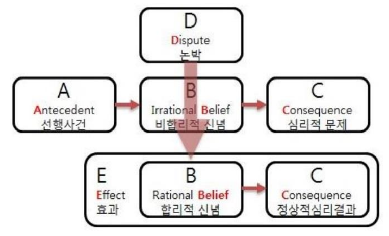 비합리적 사고가 융통성 없이 적용될 때 문제가 되므로 스트레스에 직면했을 때 불쾌한 사건(A)과 느꼈던 감정(C)의 정도를 알아보고 그 상황 속에서 했던 생각(B)을 찾아내어 그 생각이 지나친 것이라면 논박(dispute: D)하여 합리적으로 생각해 보고 느껴지는 감정의 변화가 있는지 돌아보는 자세가 필요하다.