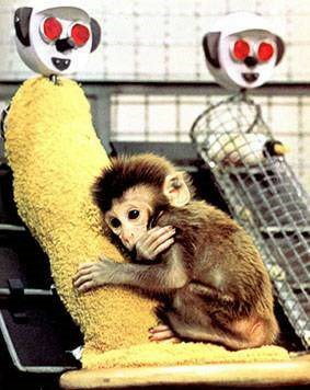 할로우는 새끼 원숭이에게 포근한 감촉을 주는 대리 어미나 먹이를 주지만 철사로 되어 있는 대리 어미와 함께 있도록 하고 어떤 대리 어미와 애착을 형성하는지 조사했다. 생리적 욕구 만족이 애착의 원인이라면 먹이 주는 대리 어미에게 애착을 형성하겠지만 실제로는 먹이 먹을 때를 제외하고는 대부분을 포근한 감촉의 대리 어미에게서 시간을 보냈다.