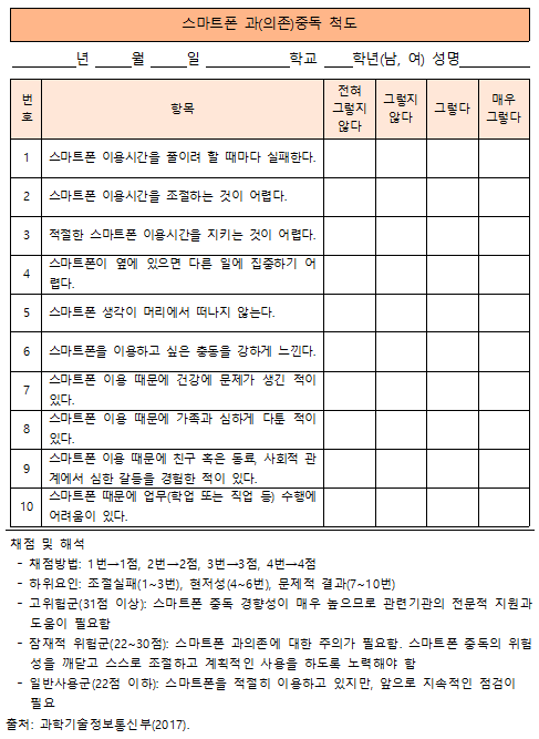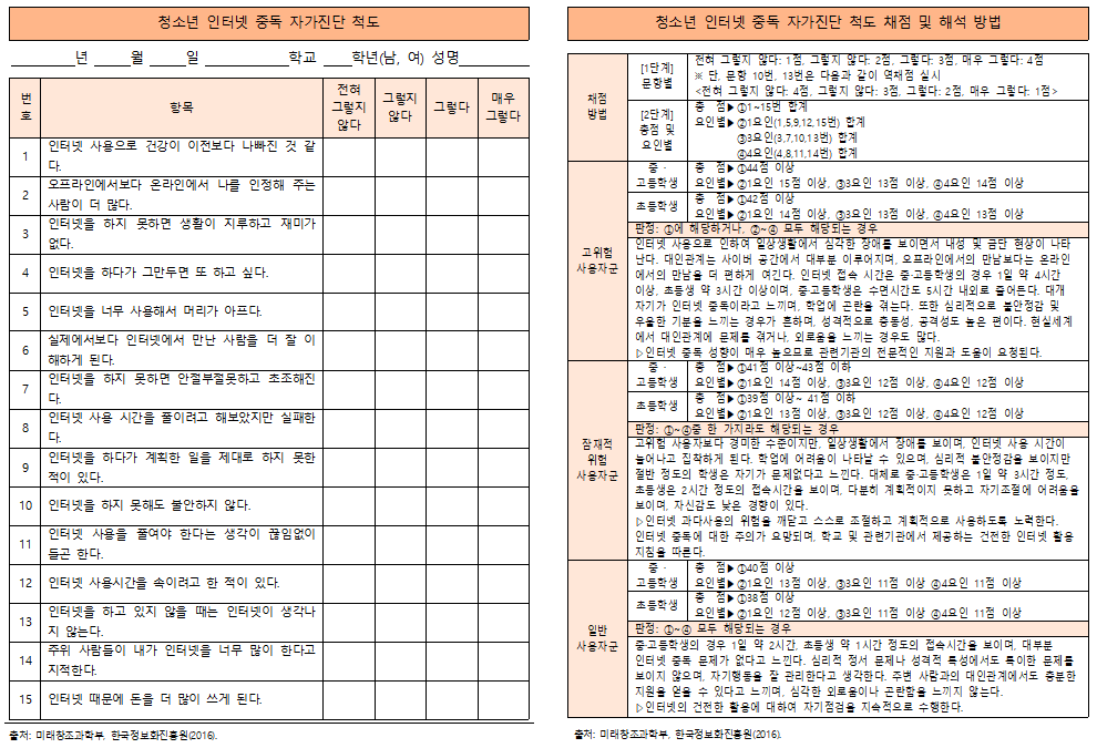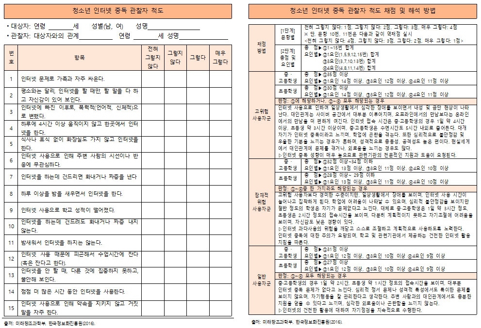 인터넷 중독 정도를 평가하기 위한 척도 중 최근에는 한국정보화진흥원(2011)이 개발한 표준화된 인터넷 중독 진단척도(K-척도)가 가장 많이 활용되고 있다. 이 척도는 유아용(관찰자용), 청소년용, 성인용이 있다. 유아용은 관찰자용이며, 청소년용과 성인용은 자기보고식과 관찰자용이 있다. 각각 15개 문항구성, 모두 4점 척도, 총점범위는 20~80점이다. 하위요인의 구성과 문항 수는 일상생활장애 5문항, 가상세계지향 2문항, 금단 4문항, 내성 4문항이다. 청소년 관찰자 진단에서는 대상은 초등학교 고학년 및 중 · 고등학생에 대한 관찰자(상담자, 교사, 학부모 등)이고, 하위요인별 문항수는 인터넷 중독 진단척도 구성과 같다.