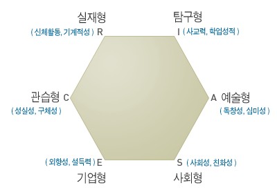 홀랜드는 육각형 모형을 통해 여섯 가지 성격 유형과 환경 및 그 상호작용 간의 심리적 유사성을 보여 주었다.