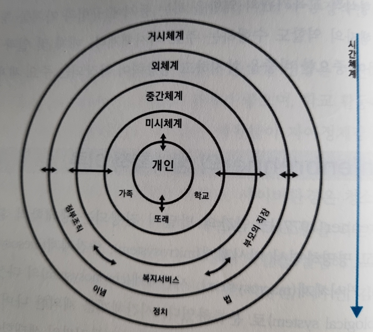 브론펜브레너(bronfenbrenner, 1977)는 인간 발달이 진행되는 생태학적 환경을 맥랃이라고 하면서 미시체계, 중간체계, 거시체계, 시간체계의 다섯 가지 생태학적 체계로 분류했다. 시간체계를 제외한 네 개의 생태학적 체계는 인간을 중심으로 겹