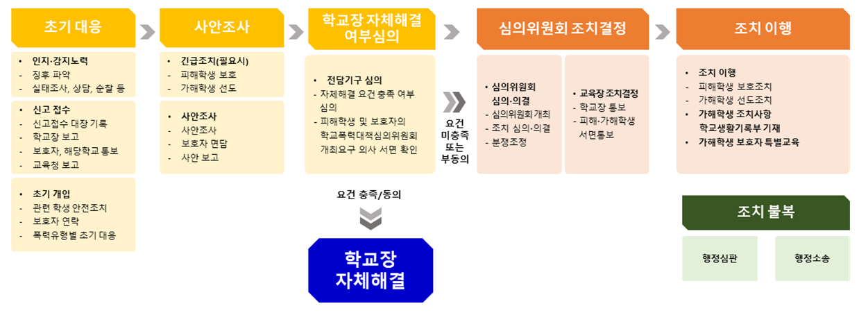 즉, 피해 학생을 위한 보호조치를 취해야 하고, 가해 학생을 위한 선도 조치를 실행해야 하며, 동시에 가해 학생에 대한 조치 사항을 학교생활기록부에 기재하며 필요시 가해 학생 보호자를 대상으로 특별 교육을 실시한다. 그러나 가해 학생 또는 피해 학생이 조치에 불복할 경우 행정심판이나 행정소송을 할 수 있다.