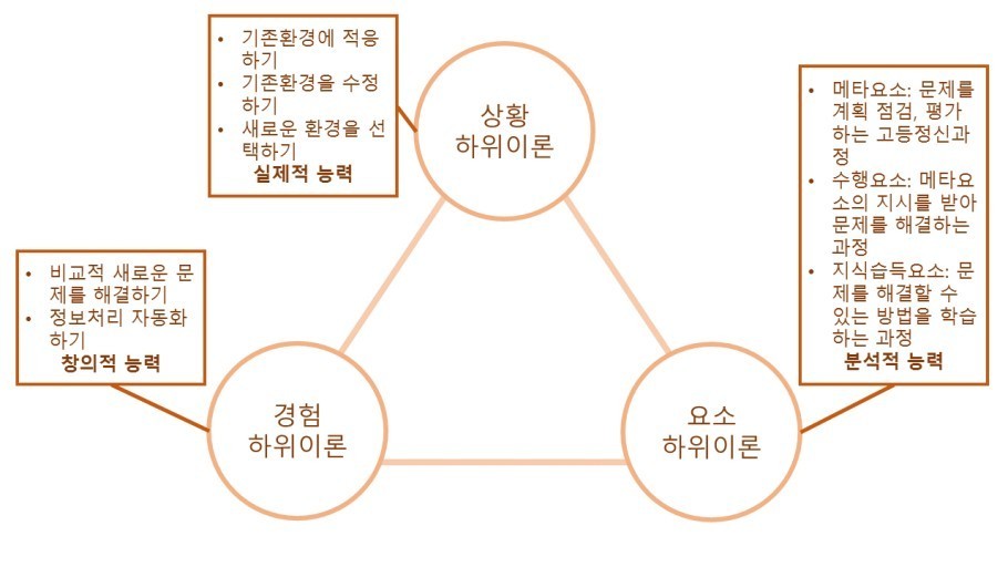 셋째, 요소 하위이론으로 문제를 푸는 것과 같은 지능 행위를 정보처리 요소 과정의 세 가지 요소, 즉 메타 요소, 수행 요소, 지식–획득 요소로 구분하여 설명하고 있다.